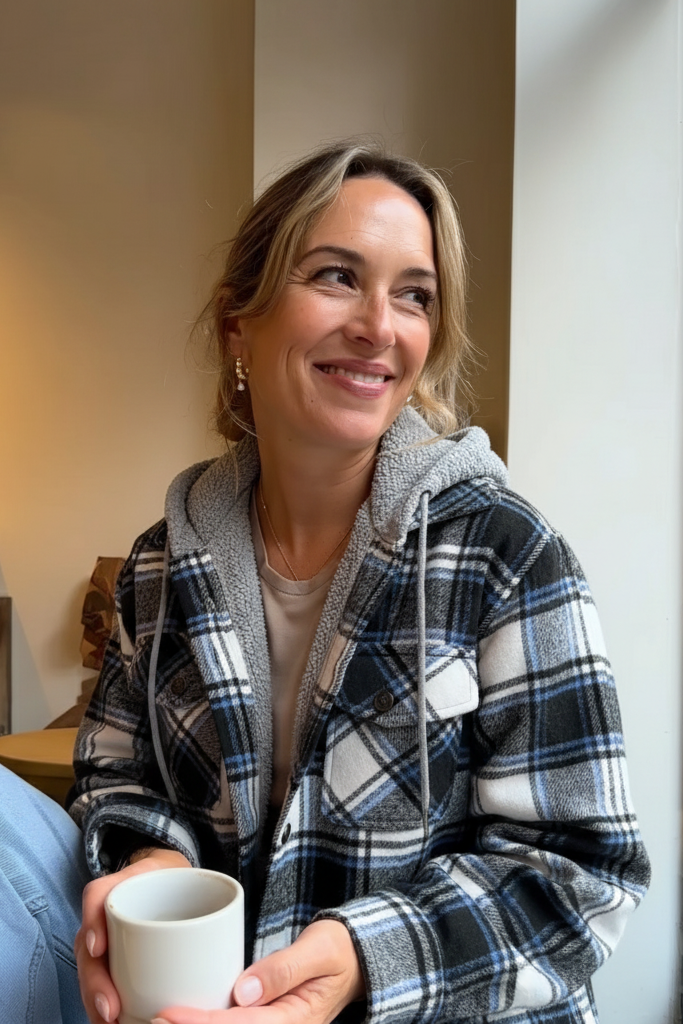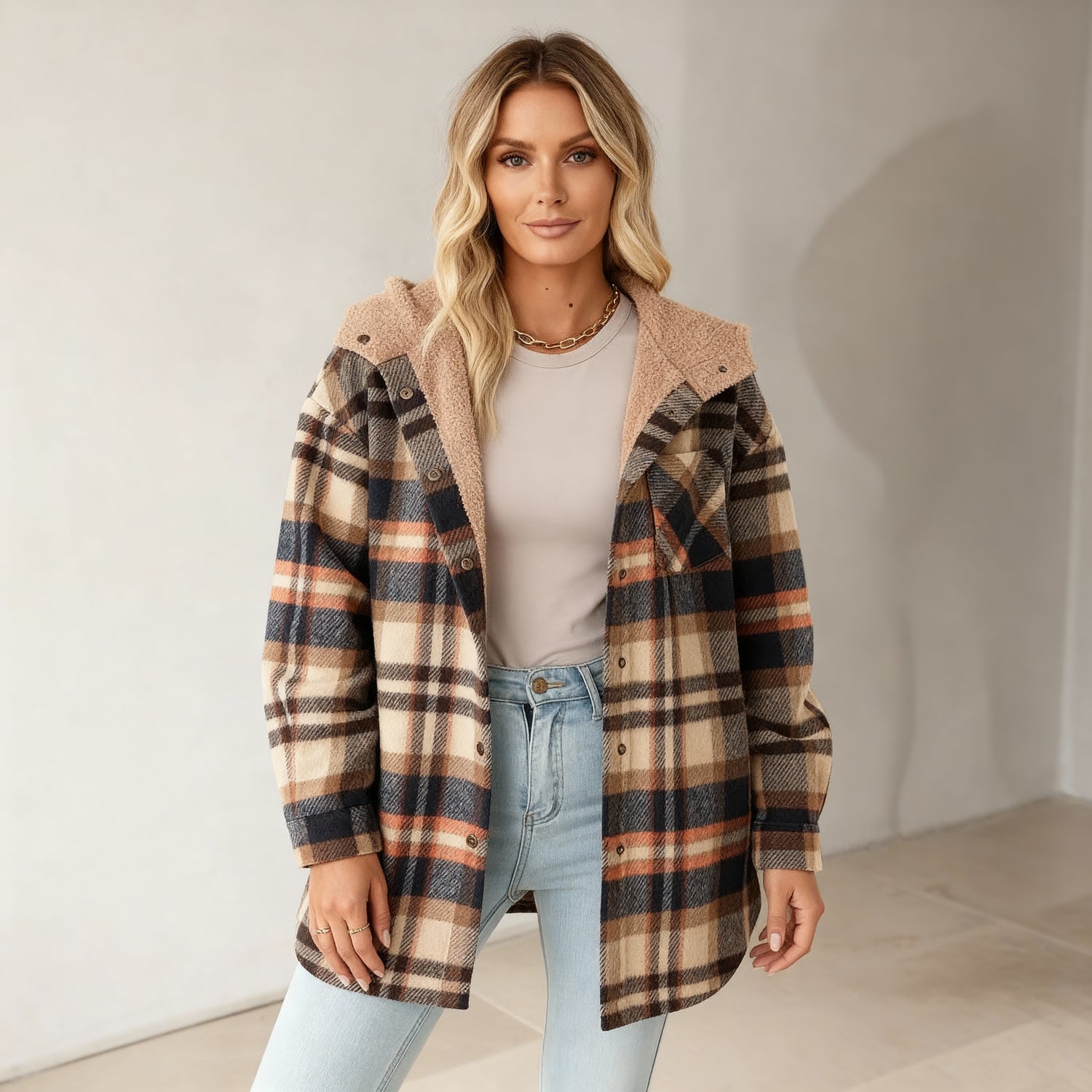 Designed for women who love to blend laid-back charm with effortless style, this jacket features a soft flannel body, a cozy drawstring hood, and a relaxed button-down fit that flatters every shape.