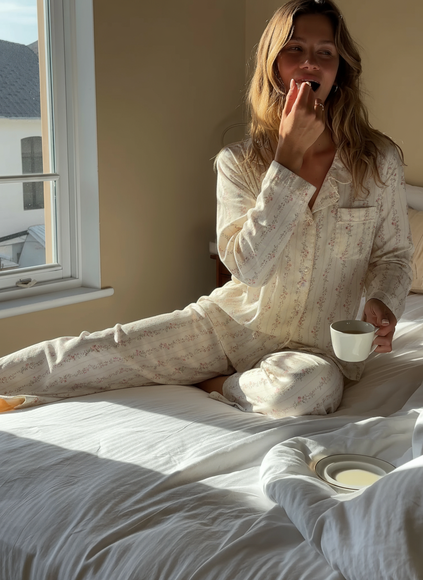 This set blends effortless comfort with subtle style. The elastic waistband ensures easy wearability, while the delicate prints—like Blossom Lines, Sunpetal Stripes, and Wildflower Field—bring understated charm to your loungewear.